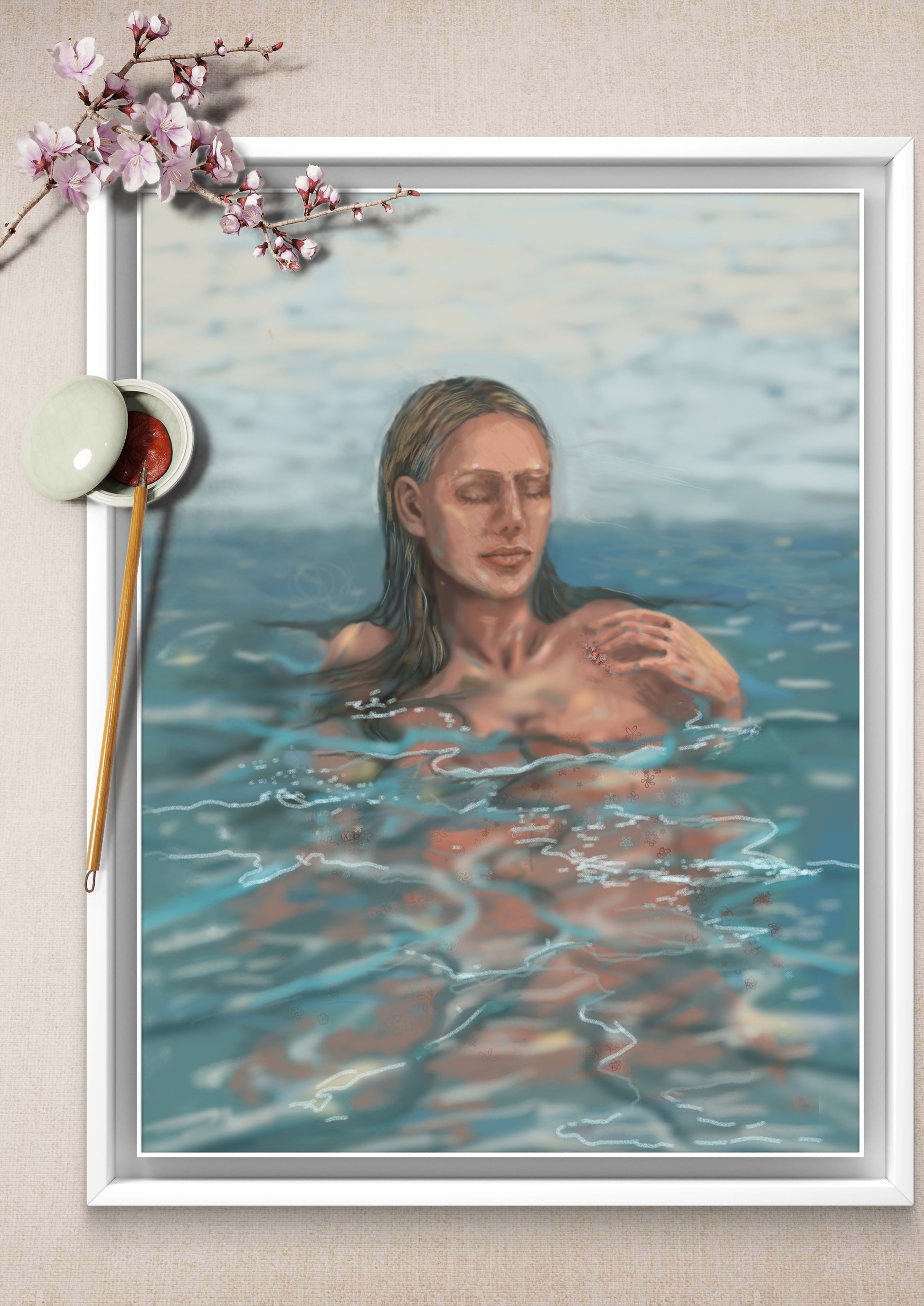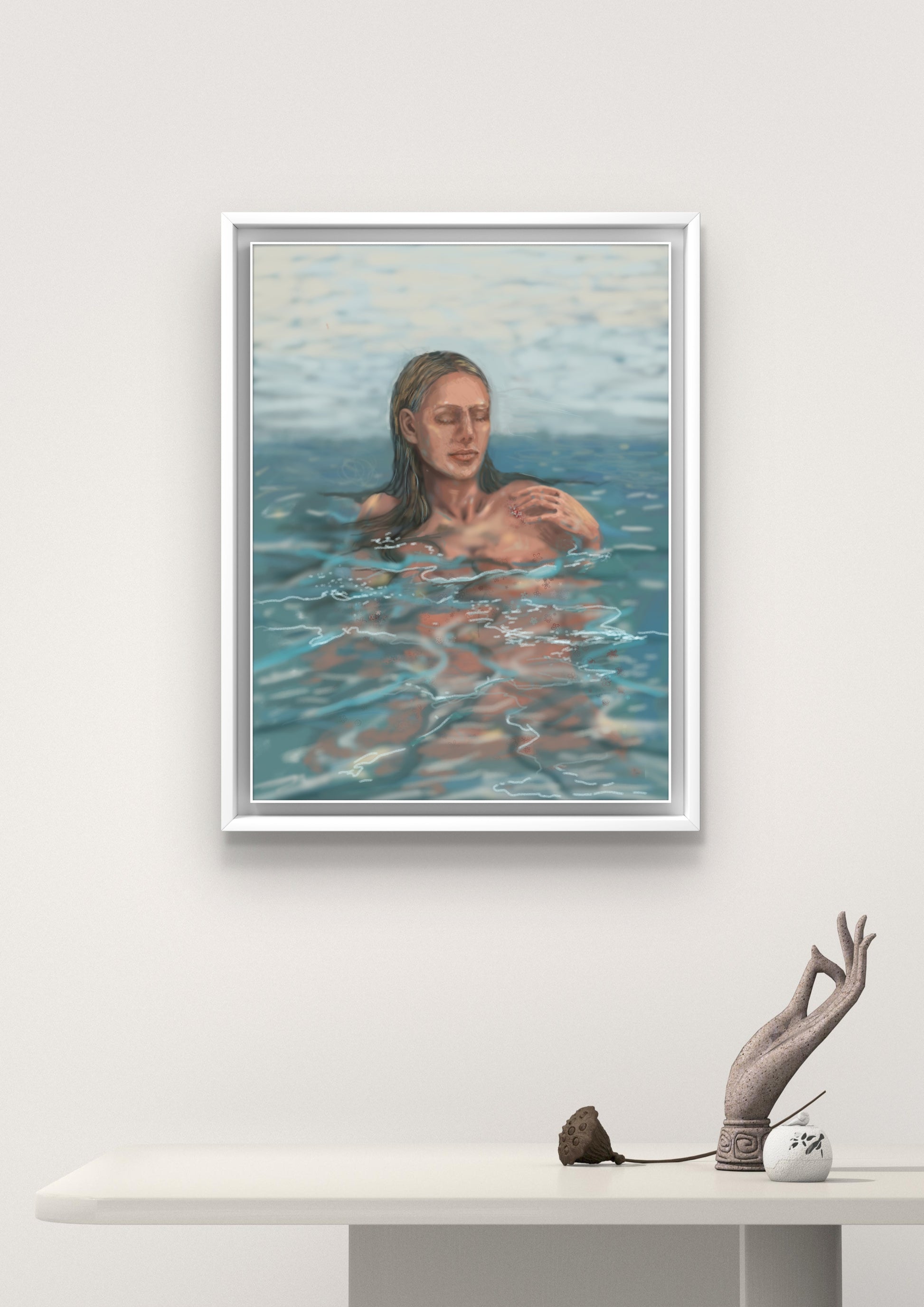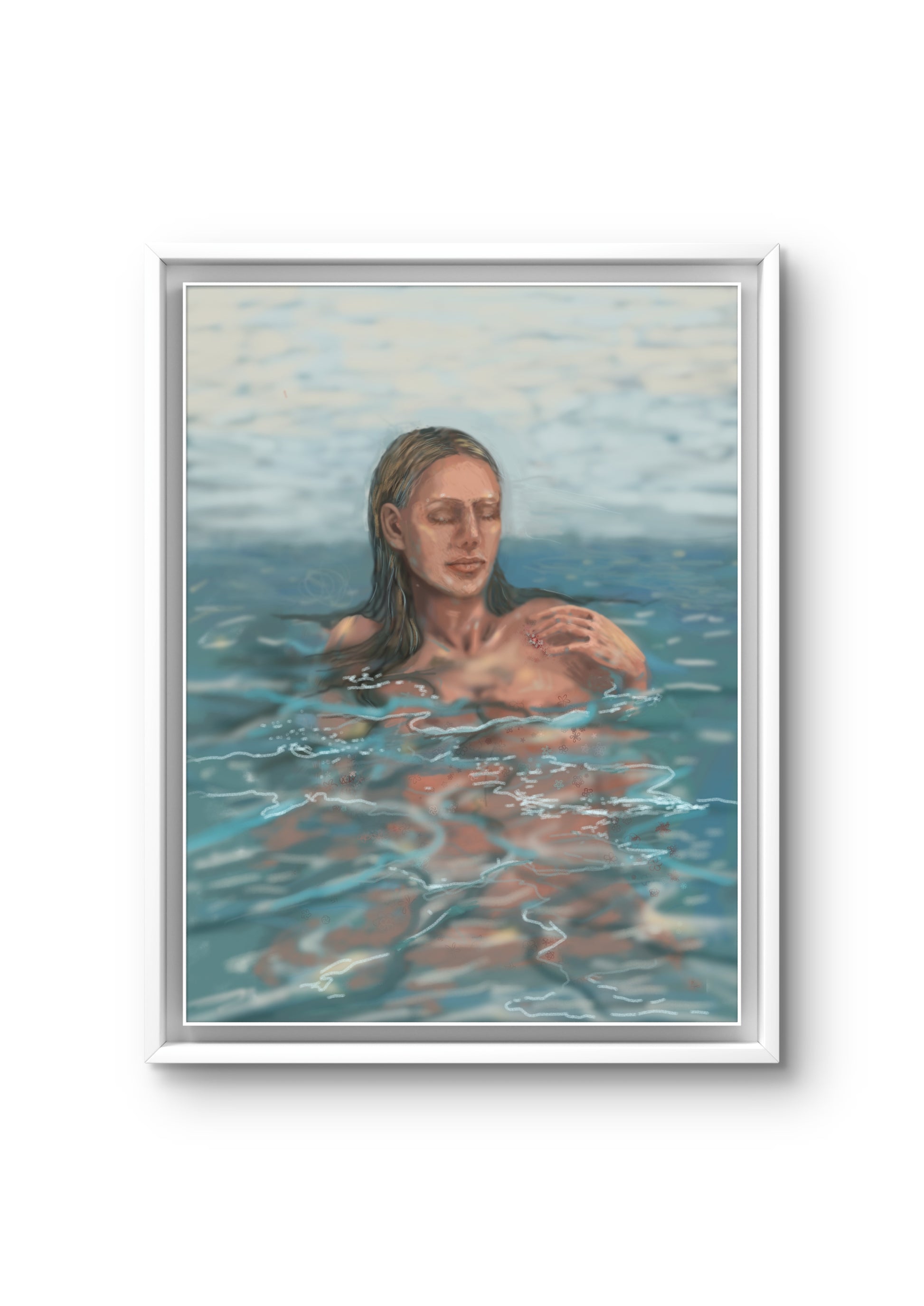 Die Figur ruht im Wasser, getragen von Licht und Bewegung – nicht ganz greifbar, fast entrückt. Die Linien des Wassers überlagern den Körper wie Erinnerungen: fließend, unklar, lebendig.